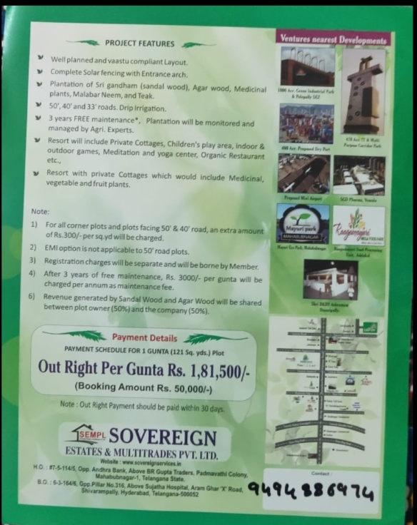 Hyderabad to banglore highway vemula Dasaripalli 1 gunta 121sqyd Price 181500 in this gunats we have kept red sandle and green sandle plants. name of the venture pakurti vanam near our venture Airport is coming full developed