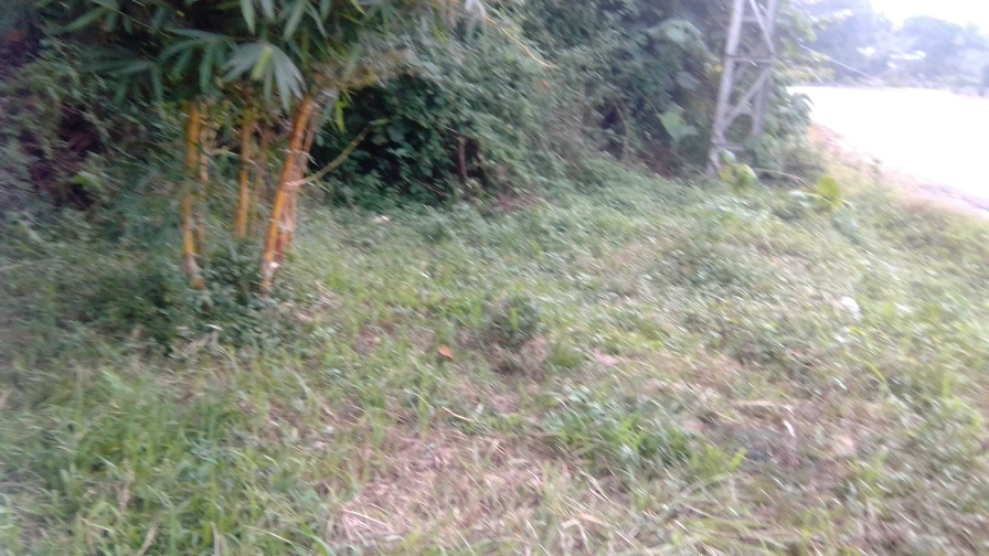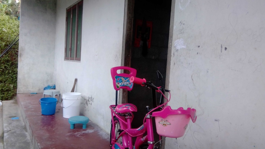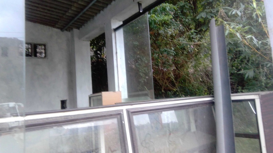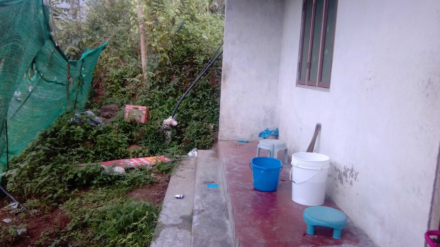 House with one bedroom, one kitchen, red floor bathroom, hall, 2 shops one with table, and water pump,