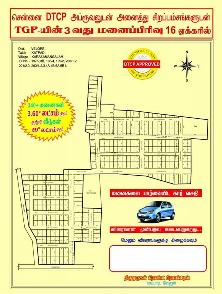 We are glad to inform you our TGP’s 3 rd Mega 16 Acre DTCP Approval project we will create New Township Close to katpadi town @ Karasamangalam.